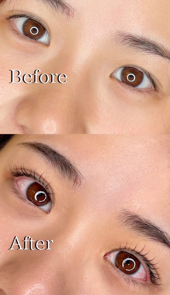 細い毛も栄養で満たされ、まるで筋肉が肥大するようにまつ毛が太くなり、綺麗なカールが持続まつ毛に負担のない漆黒でカラーリングするから、マスカラいらずで、1〜2週間ほど艶黒まつ毛が持続するよ!(生活環境で持続性は異なります)